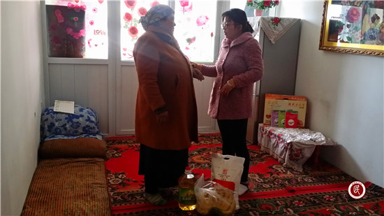 新疆民生网讯 (通讯员 周余红)春寒料俏时节,托峰社区的薄丽又去看望她的亲戚阿依吐尔逊。年初,45岁的托峰社区低保户阿依吐尔逊不慎出了车祸,碰断了左臂,生活本就困难的她无疑如雪上加霜。本来单身的她是靠做送酸奶小买卖维持生计,还有98岁的爷爷和一个10正在读小学四年级的女儿要养活,现在胳膊受伤生计更加困难。在她一筹莫展之计,社区干部薄丽和她结成了民族团结亲戚。做为一名刚刚考上社区事业编制的薄丽来说,自己工资每月不足3000元,可是每个月薄丽都会带去百元多的生活物品看望这个亲戚,她买的这些生活物质像雪中送炭,给阿依吐尔逊带来了努力战胜生活困难和克服伤痛的勇气。
