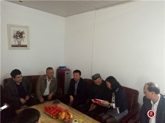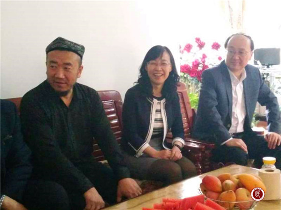 新疆民生网讯 (通讯员 傅耀心)月初的清冷终于过去,迎来的是明媚的阳光。中国银行昌吉州分行领导在得知昌吉市最大的维吾尔族清真寺“喀什寺”大毛拉吾拉音在本月24日要离开昌吉赴乌市参加宗教人士培训班,时间长达一月之久的消息后,4月21日下午,宁边路街道杨国锋书记、艾尼瓦尔副主任、驻宁合社区“访惠聚”工作队队长铁春、宁合社区书记王小燕、驻村(社区)管寺管委会主任艾力.格依提等,一起陪同刘红梅行长、李浩副行长,带着关爱看望大毛拉一家人。