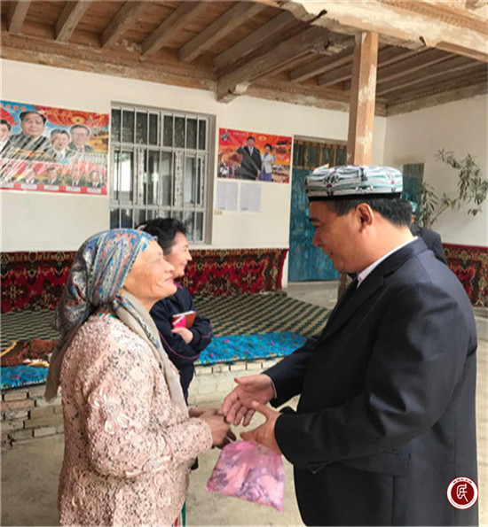 在贫困户玉苏普·纳曼家,侯全义主任给他们送去了大米、面粉还有清油,并跟远在外地上学的女儿通了电话,送去关心。临走时,玉苏普·纳曼给侯全义送上了朵帕,代表一家人对他最真挚的祝福。