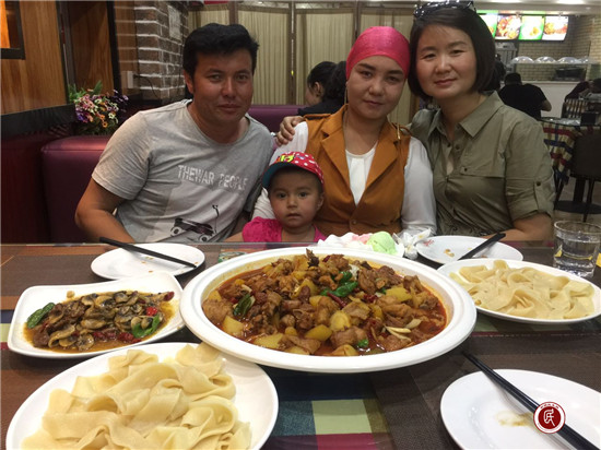 最后来到刘瑾的亲戚玉山·吐尔逊家,亲戚一家很是热情,不仅对大伙儿的看望说着“热合买提”,还让他的孩子叫阿姨叫叔叔。不再陌生的一家人边说边笑,其乐融融。聊到中午,刘瑾又主动邀请亲戚一家吃午饭,并把他们接到市里。亲戚也不停的念叨说等家里桑葚熟了一定请国库支付中心的同志们来家做客!