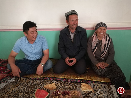 来到肉扎洪·热沙提家中,徐剑书记一进家门就被亲戚热情的拥抱、深情的问候、诚挚的握手,心里被这样如火的热情接待感动着。徐书记给亲戚说:“自从3月份结亲以来,我们之间都彼此的牵挂着对方,亲戚间就要常来常往,相互走动、相互帮助。”亲戚肉扎洪·热沙提是村里的副村长,两人在一起分析着当前稳定形势、社会发展变化以及维护民族团结的重要性和必要性。