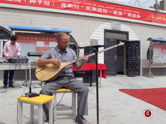 十一点整,阿克苏地区农业局(种子站)与阿克苏市阿依库勒镇库勒村“民族团结一家亲”联谊会开始了,演出开始前,地区农广校校长阿迪力.吐尼亚孜为村民做了《维护民族团结 共创美好未来》的宣讲。随后,局机关干部和村民自编自演的文艺节目相继上演了,节目有健美操、歌伴舞、度塔尔表演等,还有亲戚们搭档抢凳子、踩气球游戏呢,欢快的麦西来甫把联谊会推向了高潮,演出期间,亲戚们相互赠送了礼物。联谊会结束,亲戚们一边吃着香喷喷的抓饭,一边谈声笑语,谈论着如何脱贫致富,脸上洋溢着幸福的笑容!