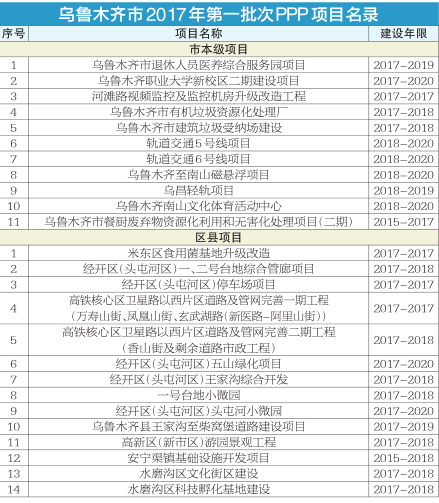 2月27日,市政府官网和市财政局官方网站上公布了乌鲁木齐市PPP续建项目和2017年第一批项目名录,希望吸引更多社会资本与相关项目实施单位前来对接、洽谈。