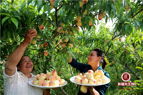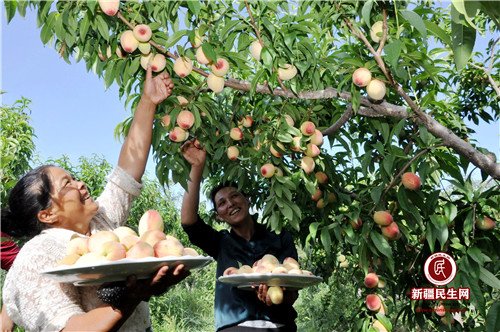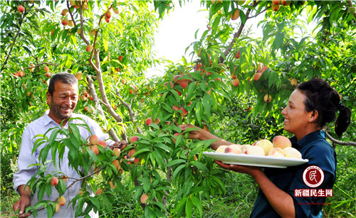 新疆民生网(颜寿林)6月17日,温宿县阿热勒镇尤喀克麦盖提村农民艾合买提·赛买提的家人在十里桃园里采摘早熟的桃子供游客免费品尝。据悉,勤劳的艾合买提·赛买提夫妻俩从2009年坚持把自己承包的100亩弃耕地改造成良田,并全部定植上新疆优质品种早、中、晚熟桃子,现桃园汇集疆内80余种名优特品种,起名为“十里桃园”,早熟桃子每年6月中旬起成熟上市,晚熟桃子成熟期为10月10日。去年100亩桃园净收入达10万元,今年5月艾合买提·赛买提又在桃园里开办了“十里桃园农家乐”,凡来农家乐吃饭的游客进园免费吃桃子,吸引疆内游客慕名前来吃饭,品尝美味鲜桃,每天农家乐日均收入在4000元以上,一举成为当地勤劳致富的带头人。