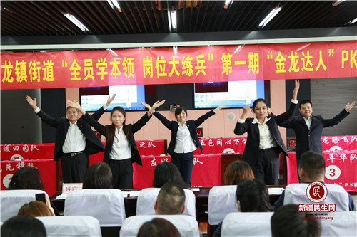 展风采聚心力,锻造过硬队伍。“工作队,居委会,工作不怕难,访贫又问苦,助困有助残,五色花正开,打造同心圆。赤橙红绿青蓝紫,民族团结舞彩练,舍小家,顾大家,无私来奉献,各族居民齐欢笑,给你们来点赞!”这是金龙镇街道“全员学本领 岗位大练兵”“金龙达人”PK赛的现场。伴随着激扬的乐曲声,来自街道、社区、管委会的七支参赛队依次上场展示风采,大厅屏幕上还播放着参赛队伍开展日常工作的画面,赛场的气氛被推向了高潮。精彩的才艺展示之后,是紧张激烈的答题环节,业务知识、政策法规、社会服务等各类知识激发了一场智慧交锋。