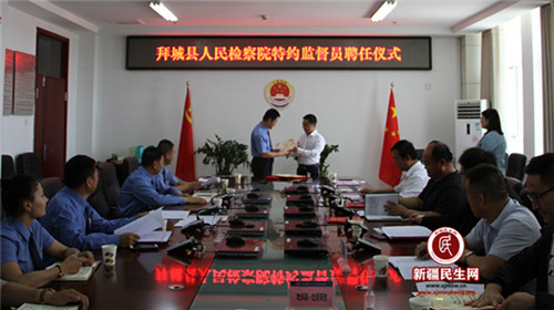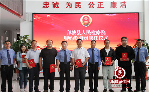 新疆民生网(袁文广、杨洁)为进一步推进全面从严治检,畅通检察机关接受外部监督渠道,搭建沟通交流桥梁,准确把握人民群众关切,推进我院检察工作取得新发展。2019年6月21日下午,拜城县人民检察院举行特约监督员聘任仪式。