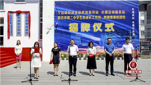 新疆民生网(杨斌 王瑞萍)6月14日,昌吉市第二中学隆重举行了“宁边路街道家庭教育指导站、心理健康服务站”、昌吉市第二中学“生命成长工作坊”、“致敬青春悦读坊”揭牌仪式。宁边路街道党工委书记任洪连,昌吉市教育工委副书记、教育局党组书记杨铁军,昌吉市教育工委副书记、教育局党组副书记、教育局局长申俊德,昌吉市教育局思政科科长冯荣和部分家长代表应邀出席揭牌仪式。