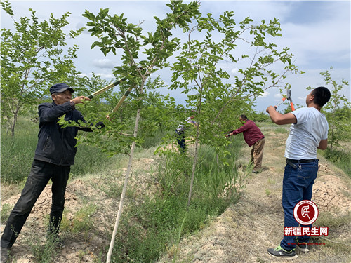 入夏时节,昌吉市三工镇三工滩上一片绿色,成片的榆树、苹果、海棠、白蜡站满了昔日大片的荒滩,去年栽种的桑树和樱桃树已开始挂果,紫的桑椹,红的樱桃和草莓,硕果累累。置身这充满生机的绿色里,谁能想到,就在4年前,这里还是一片荒滩。