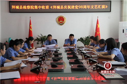 新疆民生网(杨洁)为表达检察干警对党的热爱和忠诚,2019年7月11日上午,拜城县人民检察院组织全院检察干警集中收看由全县各个单位部门所策划的庆祝中国共产党成立98周年文艺汇演。