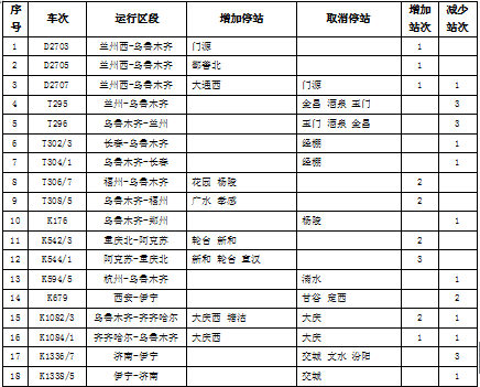 乌鲁木齐南~和田7556/7 7558/5次、5818/9 5820/17次2对客车,由原来的乌鲁木齐南站始发、终到,调整为乌鲁木齐站始发、终到。