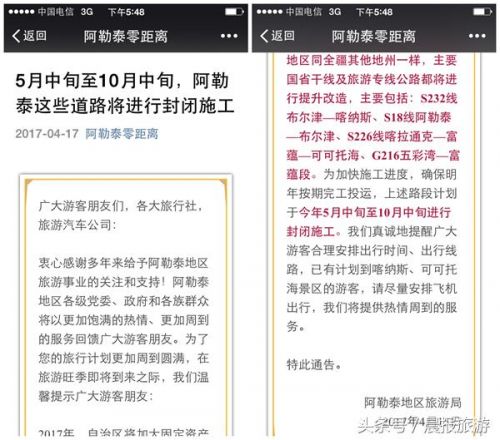 阿勒泰地区旅游局发布的道路封闭施工提示。