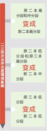 对于考生志愿填报的影响:首先,考生所处位置在合并本科二三批次后也相应调整:原来二本高分段和中分段的考生变成新二本的高分段考生,这一类考生可选择的高校范围较广,个人建议可主要考虑原二本中分段以上的高校;原二本低分段和原三本高分段考生变为新二本中分段考生,这类考生选择的范围,个人建议可主要考虑非省会城市的原二本院校,以及认可度较高及录取生源情况较好的独立学院和民办学院;原三本低分段的考生变为新二本低分段考生,个人建议这类考生可选择的范围可主要考虑民办学院和独立学院。