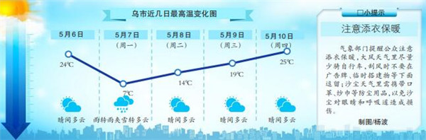 亚心网讯(首席记者 余梦凡)天气就像是一部电视剧,剧情总是百转千回。乌市6日白天最高温还在24℃,今天就要降温了。5月6日,记者从乌鲁木齐市气象台了解到,受寒潮影响,乌市城区7日最高温将跌至7℃,最低温降至4℃,并伴有中到大量的雨转雨夹雪转多云。