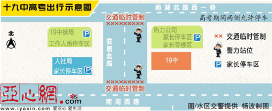 同样是针对19中考点,高考期间交警部门将对学校周边的安居北路和南湖西路路口以及安居北路和南湖北路西一巷路口进行临时管制,具体管制时间为6月7日、8日早上7:30至当天下午高考结束。交通管制期间,驾驶员可以从南湖西路以及南湖北路东二巷绕行。