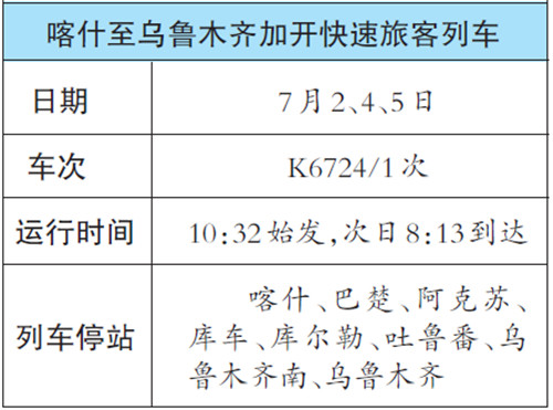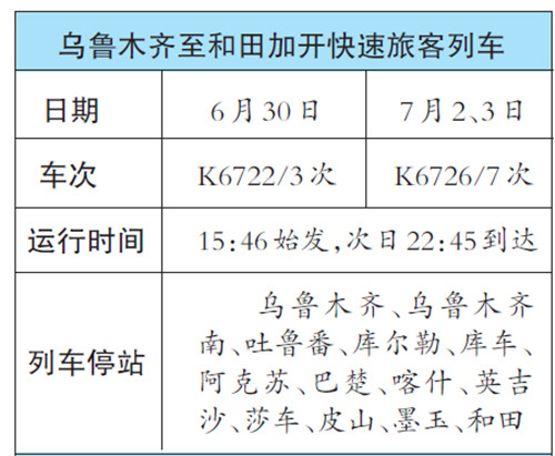 亚心网讯(记者曹华通讯员徐涛)记者6月24日从中国铁路乌鲁木齐局集团有限公司客运部门获悉,为满足暑期客流乘车需求,新疆铁路部门将加开乌鲁木齐至和田、喀什至乌鲁木齐方向快速旅客列车。