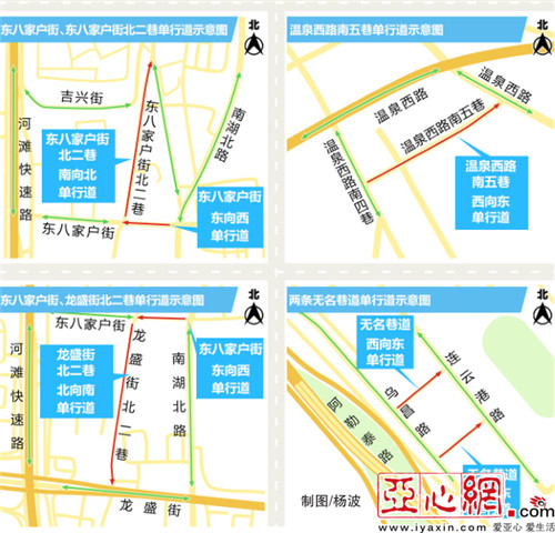 八、东八家户街北二巷(东八家户街至南湖北路之间路段)设置为由南向北方向的单行道,禁止车辆由北向南方向行驶。