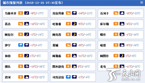 据新疆气象台预报,12月25日夜间至26日白天,伊犁哈萨克自治州、阿勒泰地区北部的部分区域有微到小雪,其中伊犁州局部区域中雪。全疆其它地区晴有时多云,风力不大。