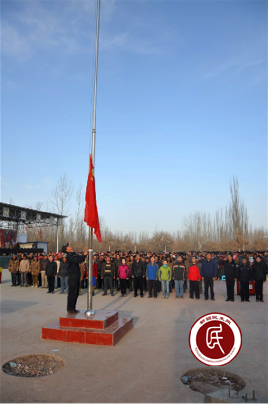 在洒满朝霞的活动广场上,全村男女老少1000余人在村干部的带领下整齐列队等待升旗仪式的开始。“全体立正”村支书阿布杜卡德尔用清脆的嗓音发出口令:“托普鲁克乡克力皮群村升旗仪式现在开始!升国旗,奏国歌!” 排成纵队的全体村民随即齐刷刷地起立,人人昂首挺胸,个个神情专注,向国旗行注目礼。伴随着雄壮的《义勇军进行曲》,鲜艳的五星红旗冉冉升起,迎风飘扬在广场上空。在此期间,工作组组员们发现有不少村民自发地高声跟唱国歌,尽管他们中不少人汉语都说不流利,但是他们那专注的表情、认真的神态还是深深地打动了我们在场的每一个人。
