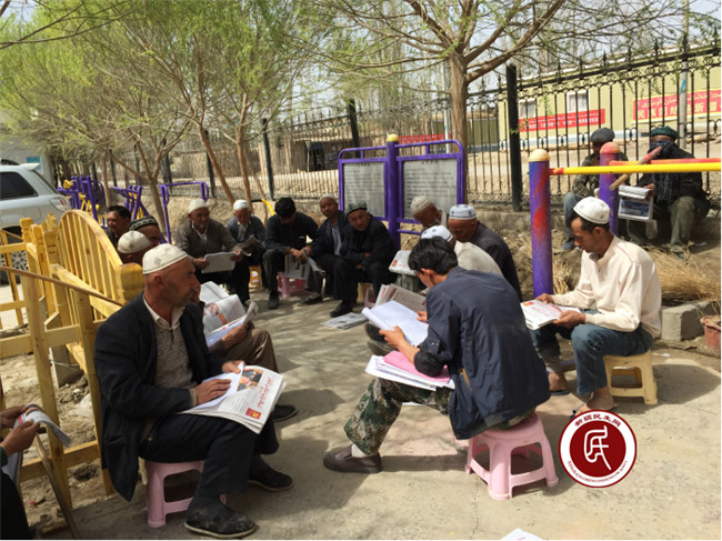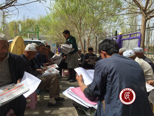 目前,阿热兰干村共有党员31名,老党员9名,入党积极分子10名。工作组与村党总支根据培训党员及重点工作的不同,建立“微型”党课,向老党员重点贯彻党章、党的理论和党员先进性等内容,向年轻党员重点宣讲“去极端化”、农技、法制、强农惠农富农政策等内容。今天的读报互动讨论党课就是组织村里的老党员一起学习党的理论、党的政策。建立“微型”党课课堂,细化学习内容、扩大学习面、突出学习重点,有利于多角度多方面有效促进每个党员综合素质的提高。