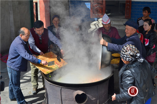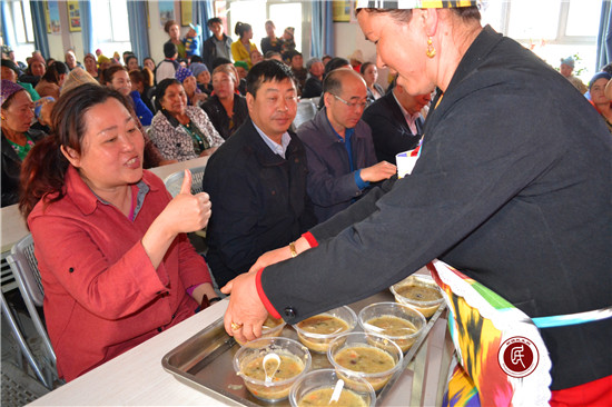 香喷喷、热腾腾的“诺鲁孜饭”端上来了,将活动带入高潮。今天的“诺鲁孜饭”是先让本村4个小队各家各户将玉米、小麦、大米、鹰嘴豆、红枣、杏干等汇集起来,加上工作队提供牛羊肉,大家一起将它们倒入大锅中,精心熬煮4个多小时做成的。这一大锅“诺鲁孜饭”凝聚了全村村民的信心和力量,象征着团结、友爱、奋进,激励着村民们奋力追求美好幸福生活。村民手里端着“诺鲁孜饭”,脸上洋溢着幸福的笑容,喜悦之情难以言表,毕竟这是2006年以来时隔11年,又再次品尝到的“诺鲁孜饭”啊!
