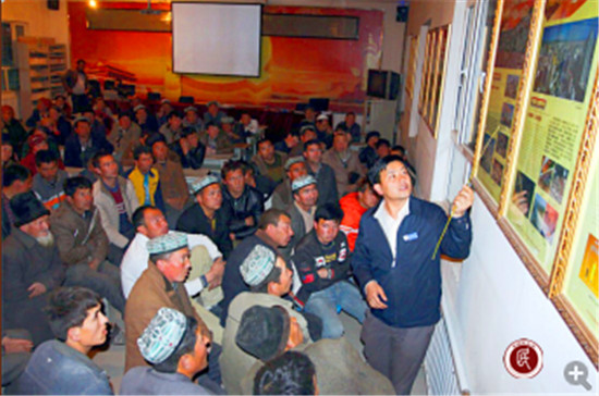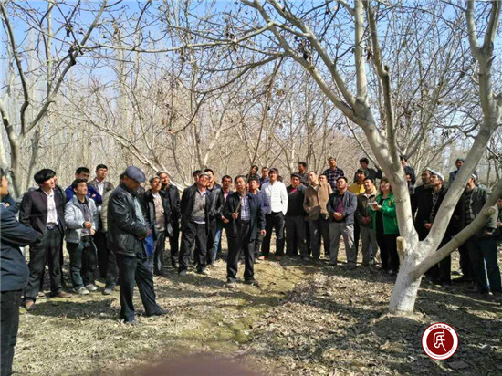 (图为村党支部书记克尤木·艾海提为参加林果技术培训的村民进行动员)