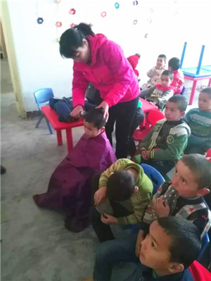 新疆民生网讯 (通讯员 冯君琳)“乖,坐好别动,很快就理完了。”今天拜城县赛里木镇拉帕村幼儿园的孩子们格外乖巧,坐的整整齐齐,眼睛正一眨不眨的看着一位美丽的大姐姐给同学理发,只见这位大姐姐身手娴熟的为一位小朋友一会儿前面用剪刀修修,一会儿后面用推子推推,不到十分钟便理好了一个,又接着为下一个小朋友理发,忙的不亦乐乎。