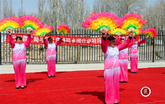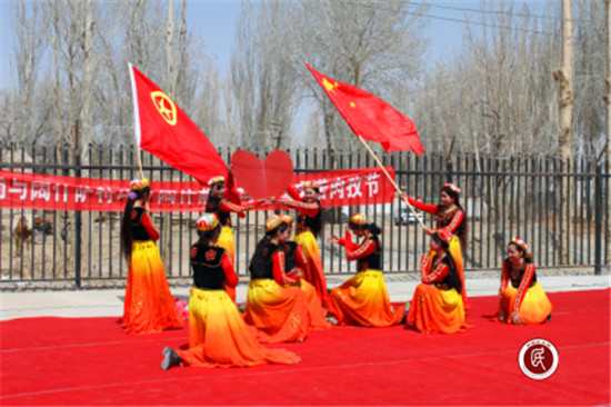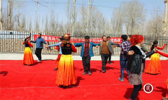 活动接近尾声时,巴州教育局走亲戚干部、乡村领导、工作队队员与各族村民在欢快的乐曲声中跳起了欢乐的维吾尔族传统舞蹈——麦西来甫。鼓乐声声,鸣奏着春天来临的序曲,舞姿翩翩,展示着民族团结的美景,村民的积极参与,再次将活动推向了高潮。