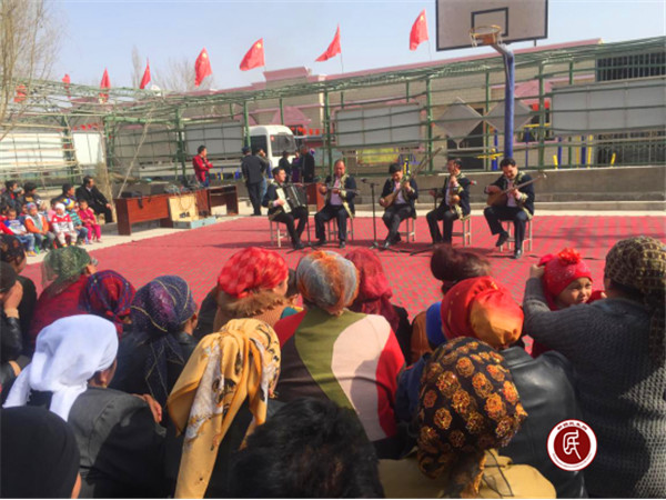 新疆民生网讯 (通讯员 孙亚峰)阿克苏纺织工业城(开发区)管委会2017年“访惠聚”驻村工作队以现代文化为引领,积极组织托普鲁克乡喀什贝希村村民群众开展“去极端化”文艺表演活动。2017年3月21日,工作队队长支俊杰邀请塔里木歌舞团来到喀什贝希村,为全村500多名村民奉献了一场精彩的文艺表演。