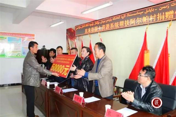 2017年起,且末县国土资源局包联奥依亚依拉克镇阿尔帕村,全局35名干部与乡亲们结对认亲,主动捐款5.6万元,用于改善牧民生产生活。其中的6000元购买了优质高原香蒜种子200公斤,支援贫困户春耕生产,发展特色经济,增加收入;5万元捐助给村委会,用于42户牧民钻打机井,改善村民生产生活条件。