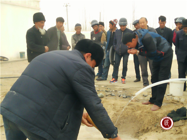 35米井位到位,技术人员迅速沉埋水管,加电启动水泵。12点42分,水管神奇地涌出了清澈明亮的机井水。成功了!成功了!围观期盼已久的牧民们,笑容满面纷纷上前掬手喝起来,真甜呀!芒莱什罕玉素甫激动地说:“感谢共产觉!感谢县国土局,让我喝上了甜甜的水,我的日子越来越好了。”