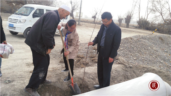 阳春三月的早上,寒冷的沙尘天气阻挡不了大家植树的热情,工作队队员和亲戚相互帮助、团结一心,一丝不苟地挖土、放苗、填土,精心栽种每一棵树苗,共同种下了这棵象征民族团结一家亲的“团结树”。“我有五个女儿,你就是我的第六个女儿,今年你们帮助下种下的果树,欢迎以后你带着家人来我家做客,吃苹果、桃子”我67岁的亲戚吐尼亚孜·阿布拉老人拉着我的手激动地说。