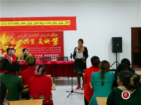 工作队副队长热依拉·吐尔洪动员大家:歌要唱起来,舞要跳起来,作为母亲,作为女人首先应该要把自己打扮得漂漂亮亮,给孩子自信,给老公面子,为自己赢得幸福。此外相互交流环节中各小队的4名妇女代表讲述了亲身经历的感人的故事来告诉大家该觉悟,该从噩梦中醒过来,找到自己的位置。