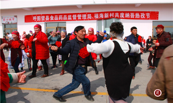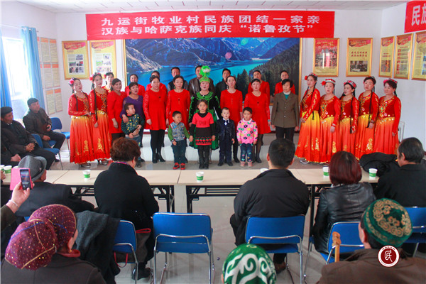 昌吉州农机局驻吉木萨尔县三台镇喇嘛昭村工作队与村民一起表演丰富多彩的节目,品尝香喷喷的诺鲁孜饭,共同迎接春天的到来。(昌吉州农机局驻吉木萨尔县三台镇喇嘛昭村工作队 马秀清)