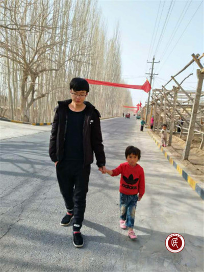 图片信息为工作队队员带着阿伊萨努尔小朋友一起入户。