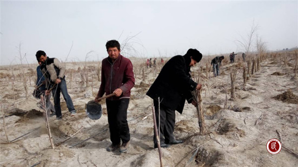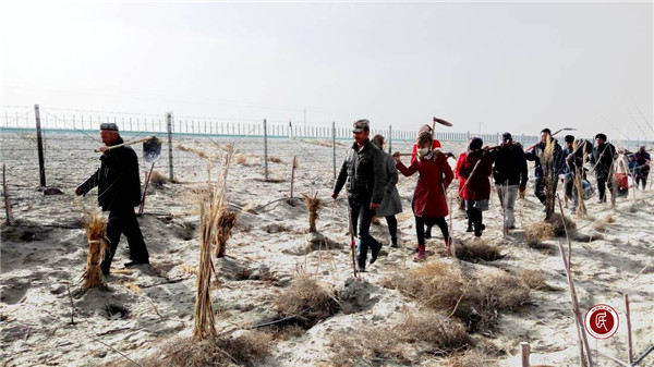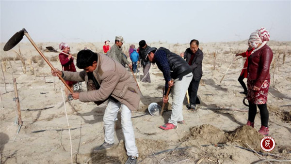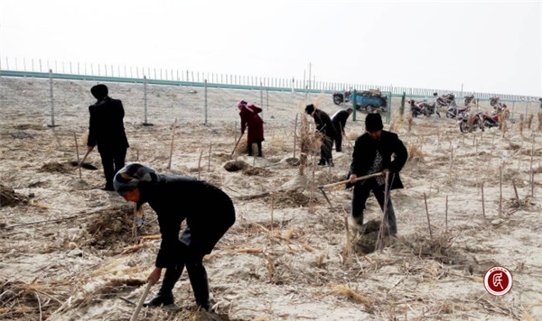 新疆民生网讯 (通讯员 王副全)3月19日,莎车县荒地镇党委政府动员村镇干部和驻村工作队队员义务劳动,在巴莎高速公路两侧植树造林,防风固沙,绿化盐碱荒漠,改善生态环境。26村驻村工作队全体队员、村两委全体干部、共产党员、共表团员60余人参加了植树义务劳动。26村植树区域是巴莎公路旁一侧,长约一公里、宽约20米的防护林。虽然任务艰巨,但大家斗志昂扬,干劲十足。早晨迎着寒风,中午顶着太阳,在沙漠盐碱地中挥舞着铁锹、坎土曼,挖出一个个小坑,种下一棵棵树苗。一瓶水,两个馕,浑身土,一身汗,奋战一天,栽下了近万棵树苗。