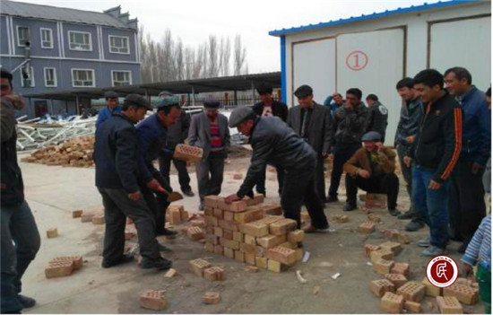 (图:驻阿克陶镇工作队联合举行“转思路、学技能、促增收”的实用技能培训,农民在学习砌墙技术,为新农村建设添砖加瓦。)
