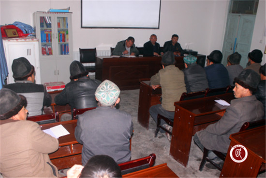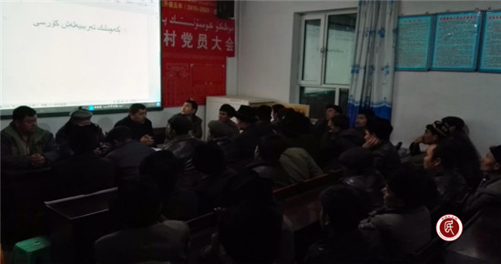 (图:克州林业局驻皮拉勒乡琼巴什村工作队利用夜校学习安排为期15天的宗教知识培训。)