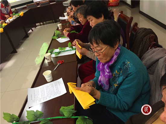 工作队队员和社区工作人员与居民一起手工制作菊花