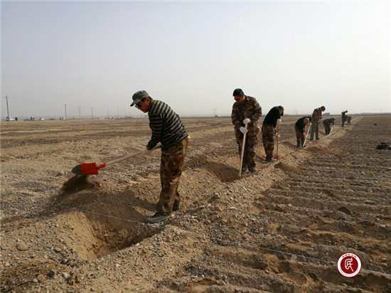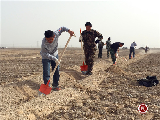 近处,一群群干部群众正抡镐挥铲,平沟填土。整个绿化现场新挖的坑立刻栽植大果沙枣树,准备好的滴灌及时开启,瞬间让我们感到浓浓绿意在心头,这一切都是值得的。这片不毛之地、风沙之源在深深融入人类的劳动汗水后,不再那么可怕、可恨,甚至充满了希望。面前的每个人身上都落满了厚厚的尘土,但他们都是乐呵呵的。的确,春天的扬沙浮尘令人望而生畏,但人类并没有因此退缩,辛勤的劳作和乐观的精神,正一点点创造绿色,凝聚希望。