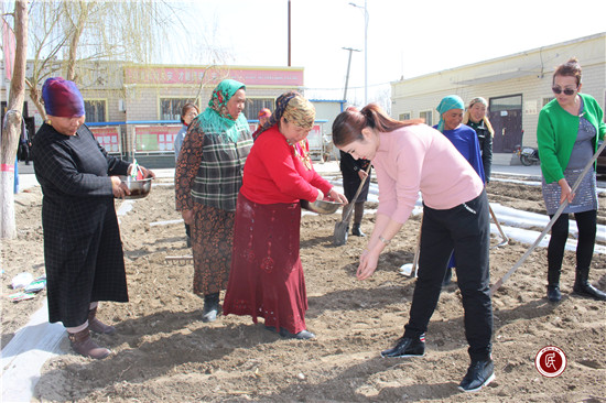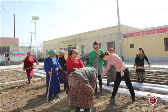 新疆民生网讯(通讯员 马依拉•月提库尔)3月28日一大早,工作队在村委会前面的空地上种起了蔬菜,周围村民也自发赶来帮忙。我们一边劳动,一边给村民讲解蔬菜富含多种的维生素,要科学种植绿色蔬菜的理念,村民们也向我们传授土地起垄和菜苗移栽的注意事项。我们种上大家爱吃的蔬菜、瓜果,一方面可以自给自足,另一方面等蔬菜瓜果成熟后,走访入户时也可以用来慰问村民。大家在一起有说有笑,其乐融融,都感到干活不累,真正做到在劳动中交心知心,在劳动中建立信任和友谊。