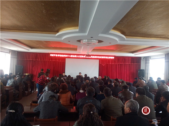 奇台县“访惠聚”驻村工作领导小组办公室总领队姜斌来到七户乡平顶村向党员、十户长、村民等100余人宣讲、解读习近平总书记在参加十二届全国人大五次会议新疆代表团审议时的讲话主要精神。