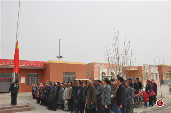 宣教大会开始前,工作队和“两委”班子组织群众举行“升国旗  唱国歌”仪式。党员干部和十户长、小组长们带头唱起国歌,国歌声响彻克孜勒套村上空,全体人员心潮澎湃,面向国旗,脱帽、摘头巾,队伍整齐、形容严肃、表情庄严。