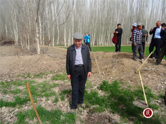 (图为:热木提拉·托合提局长走进田间查看冬小麦长势)