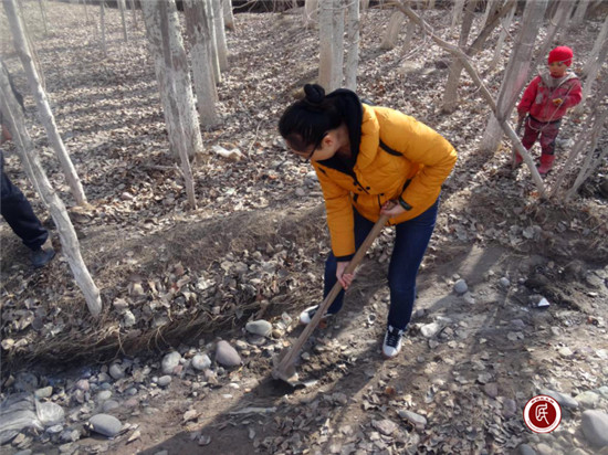(图为:驻村工作队队员李晓玲在清理水渠)