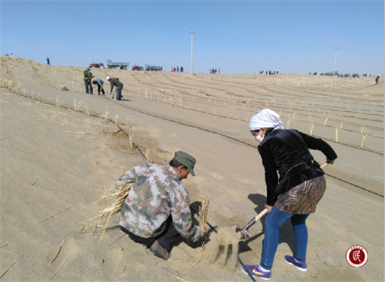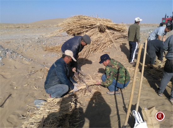新疆民生网讯 (通讯员 霍学斌)阳春三月,新绿初绽。为加快防沙治沙生态工程建设步伐,切实改善生态环境,2017年3月30日,巴州住建局驻且末县阿热勒乡阿热勒村工作队联合村“两委”班子组织村民共计110余人,深入且末县河东治沙基地,开展一年一度的防沙治沙春季植树造林工作。