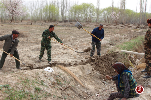 自工作队驻村以来,在走访过程中,得知帕提汗·吐尔迪老人丈夫早已去世,有四个女儿。现在四个女儿也都已经出嫁,而老人因为年老体弱,已经无法完成春耕,工作队便积极主动地带上工具,到老人家的地里帮助修整水渠、翻地等。