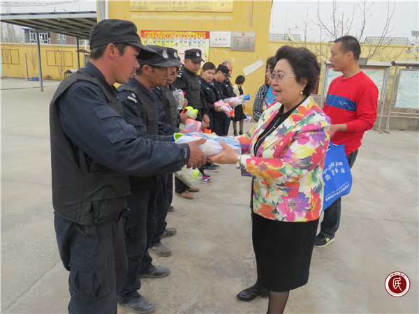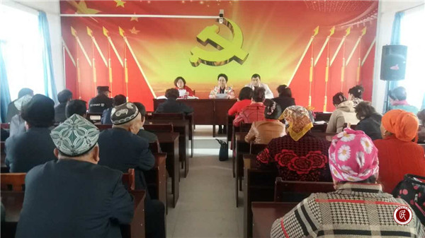 新疆民生网讯 (通讯员 张娜 程友敏)2017年3月30日,上午10:00,自治区妇联党组副书记,主席哈斯也提·艾力的身影出现在喀什市乃则尔巴格镇群布斯村的晨会上,会场里的村干部、乡镇下派干部、驻村管寺队、男女小队长、村警们又惊又喜,情不自禁的鼓掌欢迎。哈斯也提·艾力向大家逐一问好,并一起再次重温了“两会”精神及习总书记在参加十二届全国人大五次会议新疆代表团审议时的重要讲话内容,鼓励大家要不忘总书记的嘱托,扑下身子尽职尽责的做好自治区维稳的各项工作任务。