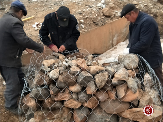 图为驻村工作队干部将山上捡来的石头运送到防洪口