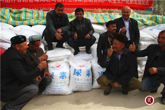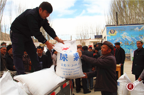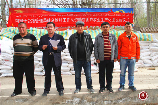 新疆民生网讯 (通讯员 靳涛 亚力坤·卡的尔)春回大地,万物复苏。正值春耕春播的农忙时期,为落实精准扶贫工作要求,鼓励贫困户发展农业生产,4月3日上午,在举行完升国旗仪式后,阿图什公路管理局驻乌恰村工作队在前期入户掌握情况的基础上,与村“两委”充分沟通后,为550户贫困户发放价值3.2万元的化肥550袋,以解决贫困户实际困难,帮助贫困户增产增收。