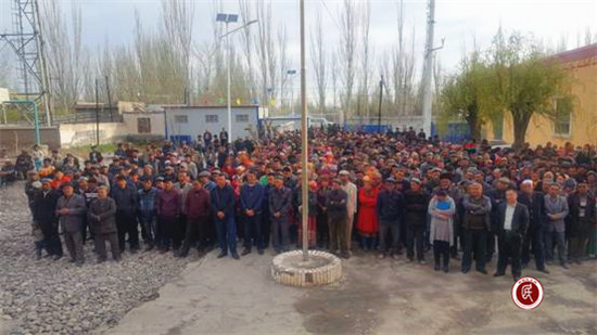 新疆民生网讯 (通讯员 凯丽)4月3日早上,克州农业技术推广中心驻阿克陶县皮拉勒乡依克其来村工作队利用周一升国旗时机,组织依克其来村968名村民、工作队队员、驻村管寺人员、村干部、警务室民警辅警、幼儿园老师开展对吾布力喀斯木·买吐送发表的《致维吾尔族同胞觉醒书》、《致柯尔克孜牧民的一封信》、及《新疆维吾尔自治区去极端化条例》宣讲活动。